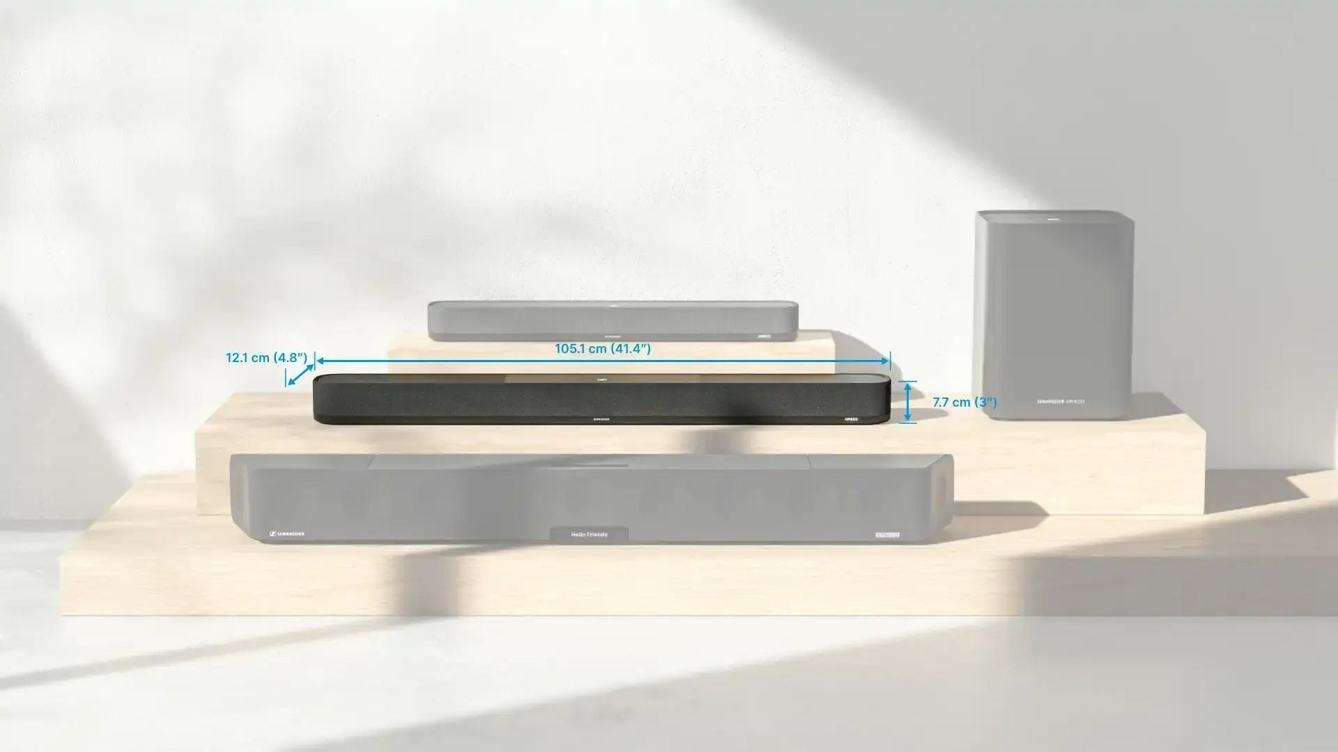 The soundbar is designed to perform with Sennheiser audio DNA. Seven high-end aluminum cone full-range drivers ensure incredibly sharp fidelity and clear mids. Closed chambers hold dual 4” long-throw woofers for bass as low as 38Hz.
