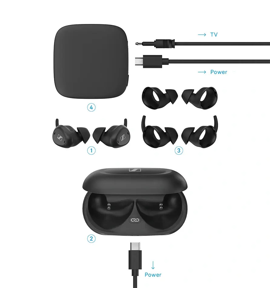 The TV Clear Set includes (1) lightweight (6.9g) True Wireless earbuds, (2) charging case, (3) additional ear adapters, (4) the transmitter, and all required cables.